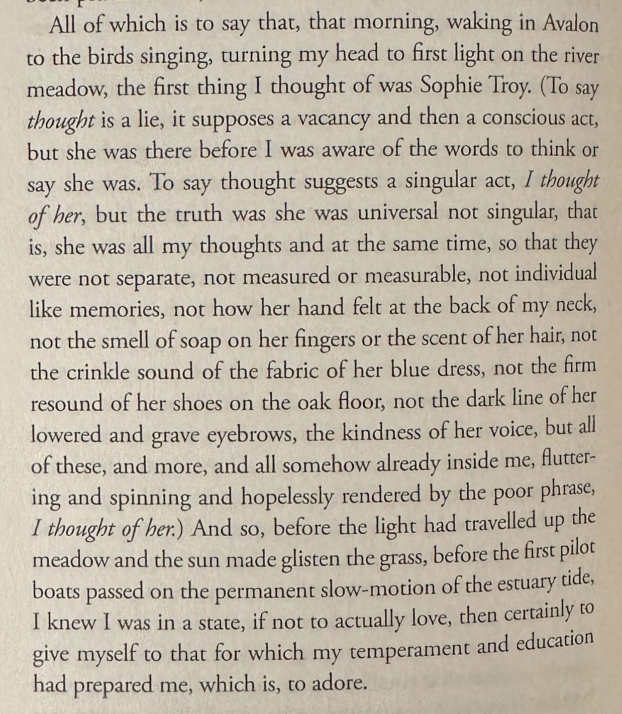 on her recommendation, and like every single one of her recommendations it did not disappoint.5. I am 65% of the way through This Is Happiness by Niall Williams and it is already one of my favorite books I’ve read or will read this year. It’s a retrospective written from the point of view of an man reflecting on the summer that his small Irish town installed electricity. Its premise is necessarily small and contained, effectively magnifying the gravity of the interpersonal conflict, the love and loss and leaving at the alter, in contrast. Every other page features a description that is so creative and evocative it makes my jaw drop: “pale, water-coloured children,” “the air had the slender, quickened and hopeful spirit that is in the word April.” This is a passage wherein Noel, Noe for short, writes about what it felt like at seventeen, falling in love for the first time (!!!):