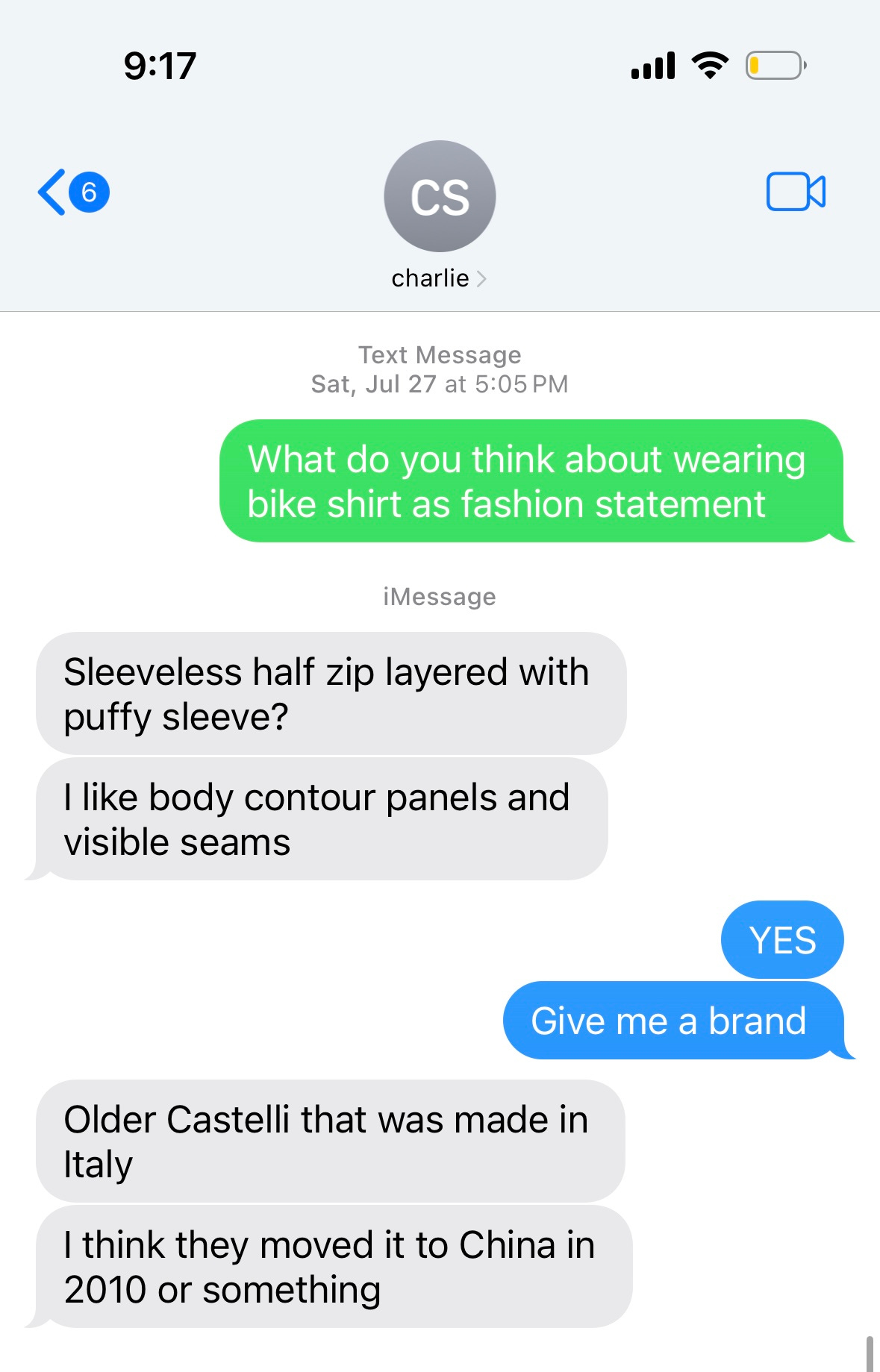 I can’t believe it had never occurred to me before, given that every time I see another hardo (with love) road biker in Prospect Park I think “hello, gorgeous,” not only for their toned legs but also for their body-hugging kit. The bike shirt is a silhouette so tailor-made for appropriation from the fashion set. A gorgeous high neck, a quarter-zip front for choose-your-own-adventure immodesty, exposed seams that accentuate the shapeliness of your torso, and all the graphic appeal of its forebearers.